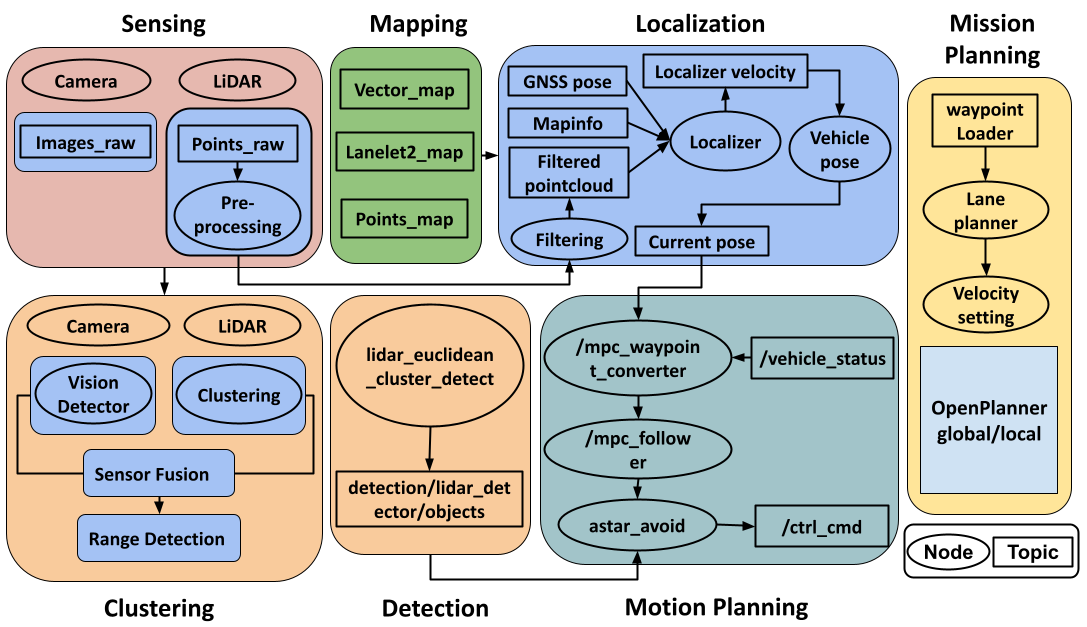 High-level sensors connect to a primary compute unit. Autoware handles core AV functions (lane following, obstacle handling, traffic light and lane detection), while a custom bridge translates ROS control to UDP toward low-level controllers. The modular design eases integration of third-party drivers and research modules.